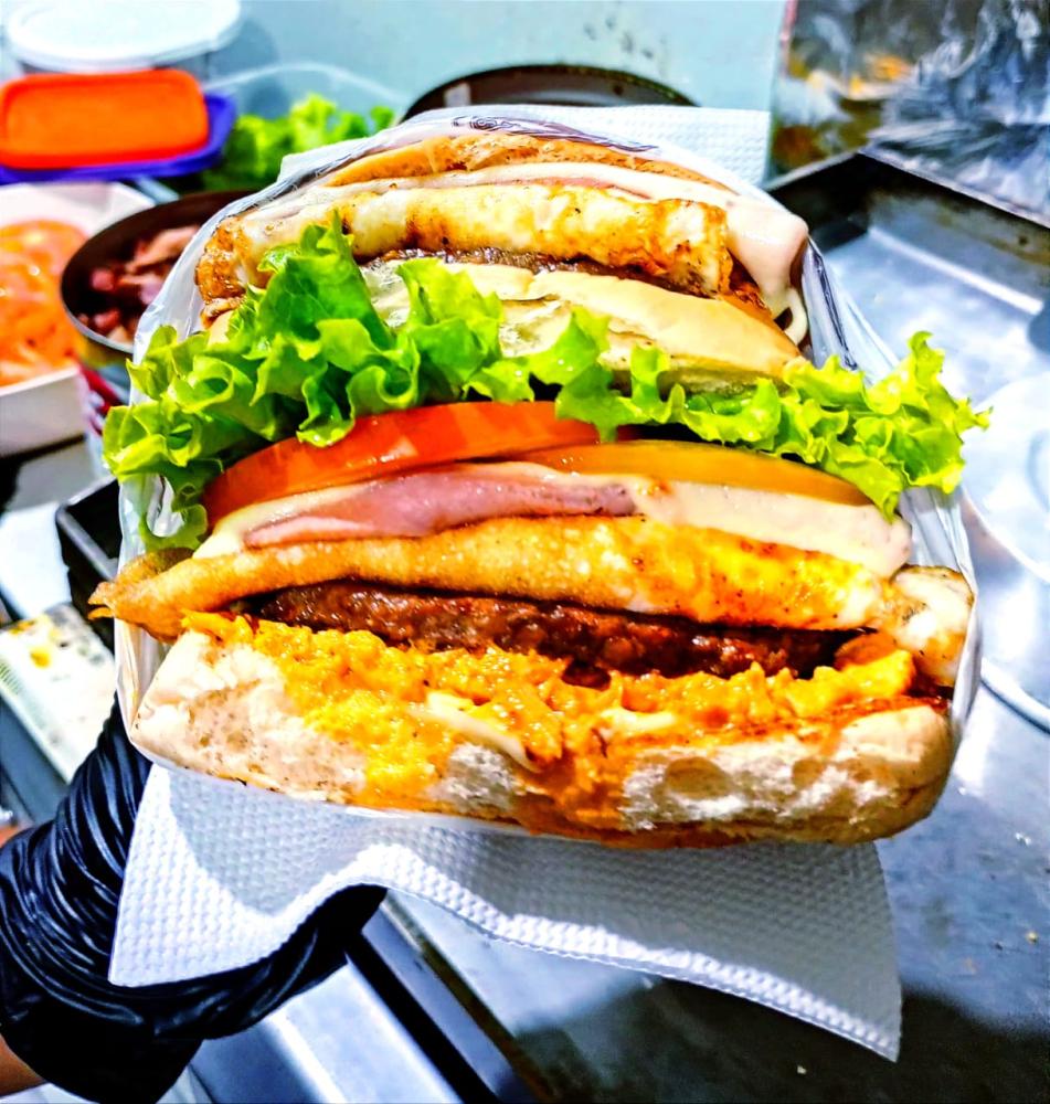 PAO, 2 CARNES DE HAMBURGUER, 2 OVOS,2X MUSSARELA, 2X PRESUNTO, FRANGO, ALFÁCE, TOMATE, MILHO E BATATA