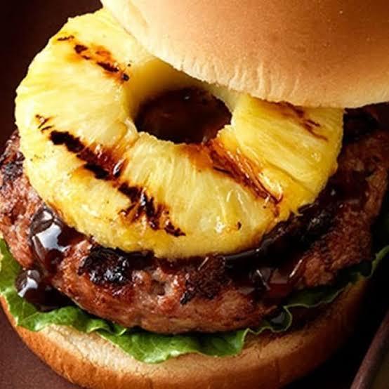 PÃO BRIOCHE, CARNE ARTESANAL DE 120G, OVO, ABACAXI, BARBECUE, QUEIJO CHEDDAR, SALADA MILHO E BATATA.