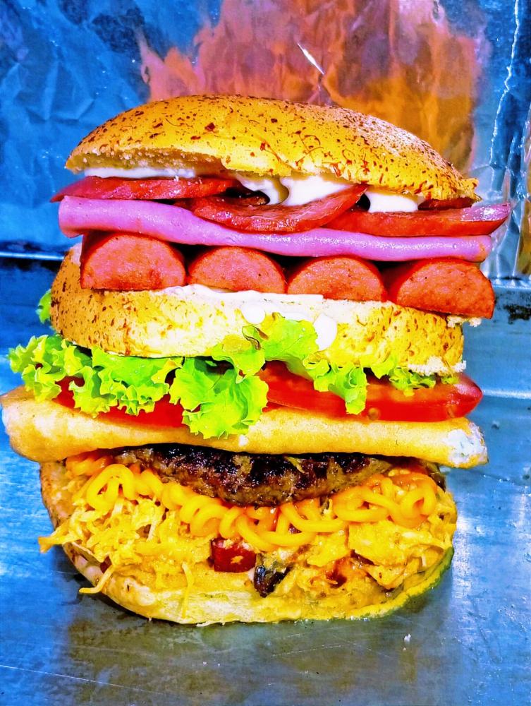 PÃO BRIOCHE, BLEND ARTESANAL DE 120G, PRESUNTO, DELICIOSO BACON, FRANGO DESFIADO, OVO, BARBECUE, QUEIJO CHEEDAR, SALSICHA, SALADA, MILHO E BATATA PALHA